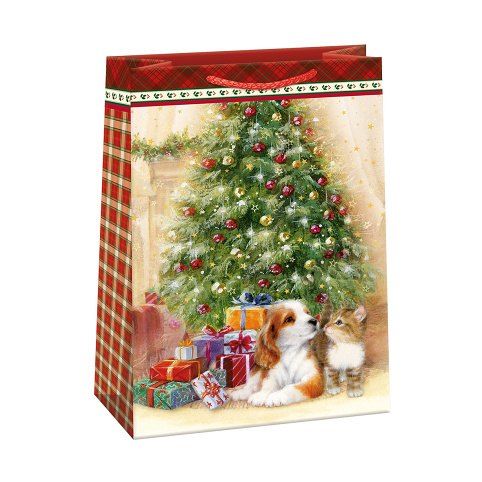 Matná vánoční papírová dárková taška s originálním designem. Vyrobená z kvalitního pevného papíru pro rychlé a praktické zabalení dárků všech velikostí. Kvalita zpracování zaručuje dostatečnou pevnost proti protržení dna nebo odtržení oušek.