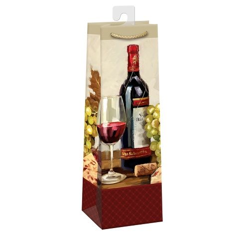 Papírová dárková taška standard na víno nebo šampaňské s háčkem a originálním designem. Kvalita zpracování zaručuje dostatečnou pevnost proti protržení dna nebo odtržení oušek. Háček slouží k umístění do stojanů v prodejnách. Po zakoupení jej lze jednoduše odstřihnout.