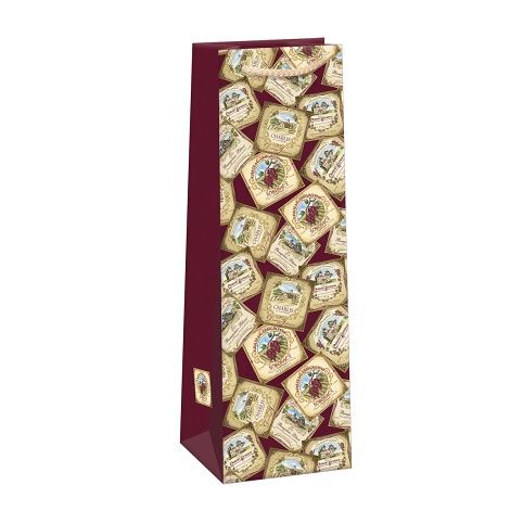 Matná papírová dárková taška s originálním designem na víno nebo šampaňské. Kvalita zpracování zaručuje dostatečnou pevnost proti protržení dna nebo odtržení oušek.