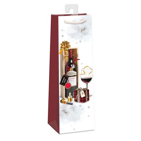 Papírová dárková taška standard na víno nebo šampaňské s háčkem a originálním designem. Kvalita zpracování zaručuje dostatečnou pevnost proti protržení dna nebo odtržení oušek. Háček slouží k umístění do stojanů v prodejnách. Po zakoupení jej lze jednoduše odstřihnout.