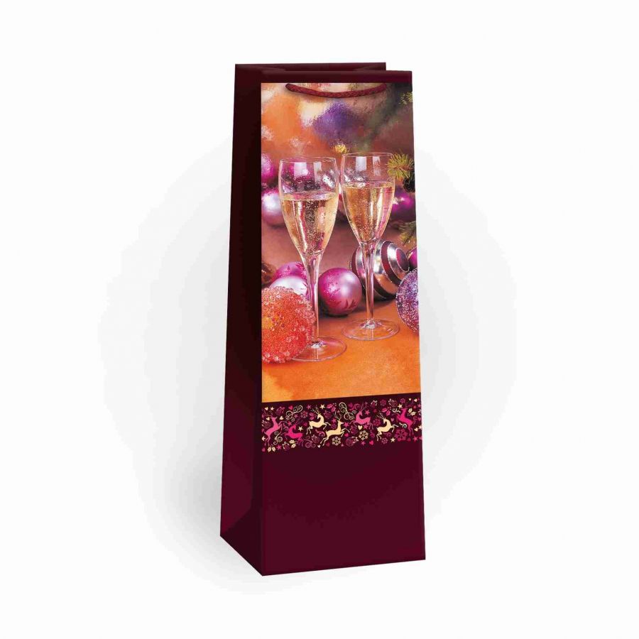 Lesklá vánoční papírová dárková taška s originálním designem na víno nebo šampaňské. Kvalita zpracování zaručuje dostatečnou pevnost proti protržení dna nebo odtržení oušek.