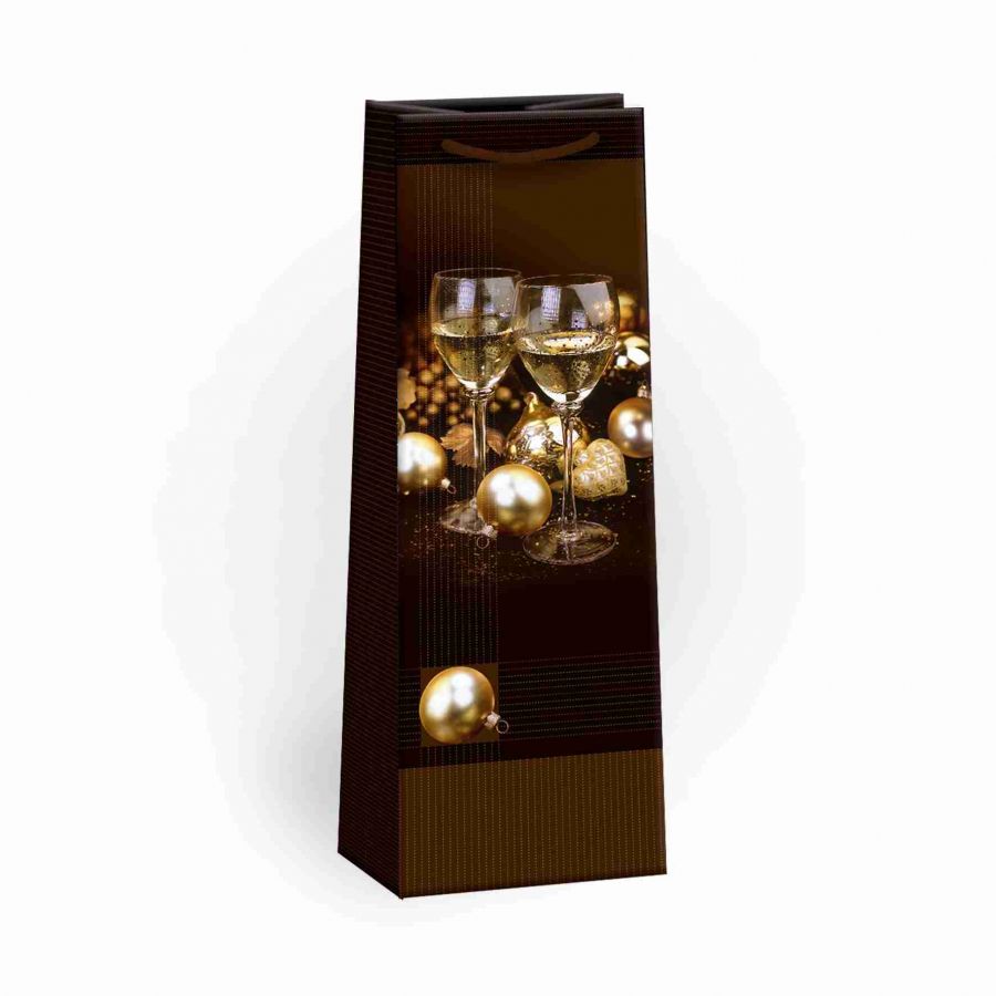 Lesklá vánoční papírová dárková taška na víno nebo šampaňské s háčkem a originálním designem. Kvalita zpracování zaručuje dostatečnou pevnost proti protržení dna nebo odtržení oušek. Háček slouží k umístění do stojanů v prodejnách. Po zakoupení jej lze jednoduše odstřihnout.
