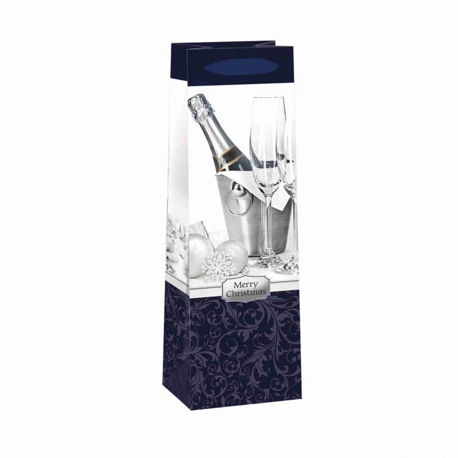 Vánoční papírová dárková taška standard s originálním designem na víno nebo šampaňské. Kvalita zpracování zaručuje dostatečnou pevnost proti protržení dna nebo odtržení oušek.