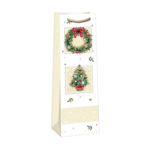 Matná vánoční papírová dárková taška na víno nebo šampaňské s háčkem a originálním designem. Kvalita zpracování zaručuje dostatečnou pevnost proti protržení dna nebo odtržení oušek. Háček slouží k umístění do stojanů v prodejnách. Po zakoupení jej lze jednoduše odstřihnout.