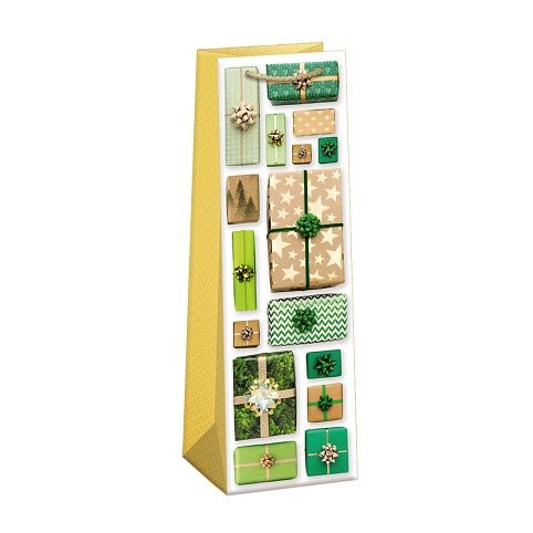 Lesklá vánoční papírová dárková taška s originálním designem na víno nebo šampaňské. Kvalita zpracování zaručuje dostatečnou pevnost proti protržení dna nebo odtržení oušek.