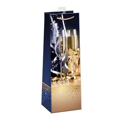 Lesklá vánoční papírová dárková taška na víno nebo šampaňské s háčkem a originálním designem. Kvalita zpracování zaručuje dostatečnou pevnost proti protržení dna nebo odtržení oušek. Háček slouží k umístění do stojanů v prodejnách. Po zakoupení jej lze jednoduše odstřihnout.