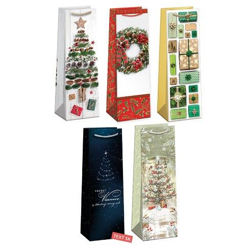 Vánoční papírová dárková taška s originálním designem na víno nebo šampaňské. Kvalita zpracování zaručuje dostatečnou pevnost proti protržení dna nebo odtržení oušek.