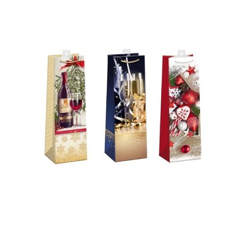Vánoční papírová dárková taška na víno nebo šampaňské s háčkem a originálním designem. * kvalita zpracování zaručuje dostatečnou pevnost proti protržení dna nebo odtržení oušek* háček slouží k umístění do stojanů v prodejnách. Po zakoupení jej lze jednoduše odstřihnout