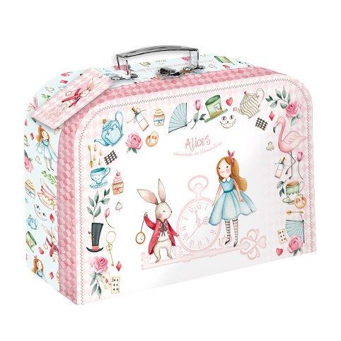 Papírový dětský kufřík velikosti 35cm Alice’s adventures in Wonderland. Kufřík je vyroben z kvalitního pevného kartonu s vnitřní potiskem a kovovým uzavíráním s rukojetí. Je vhodný na školní potřeby, výtvarné potřeby, do kterého vejde i blok barevných papírů A4. Jeho využití v dětském světě je velké, možnost uložení hraček ale i jiných drobností na cestu k babičce.