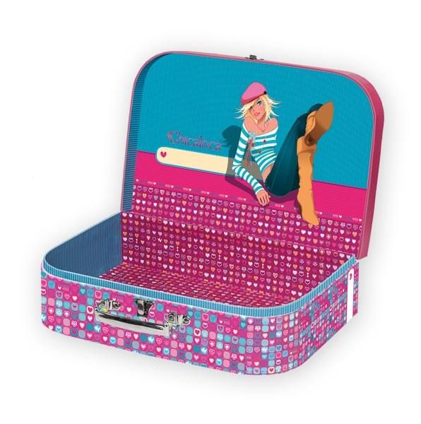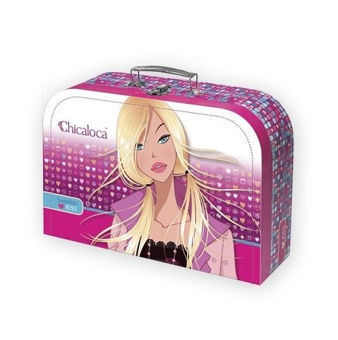 Papírový dětský kufřík velikosti 25 cm Chicaloca. Kufřík je vyroben z kvalitního pevného kartonu s vnitřní potiskem a kovovým uzavíráním s rukojetí. Jeho využití v dětském světě je velké, možnost uložení hraček ale i jiných drobností na cestu k babičce.
