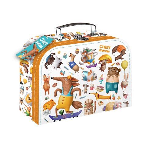 Papírový dětský kufřík velikosti 35cm Crazy Animals. Kufřík je vyroben z kvalitního pevného kartonu s vnitřní potiskem a kovovým uzavíráním s rukojetí. Jeho využití v dětském světě je velké, možnost uložení hraček ale i jiných drobností na cestu k babičce.