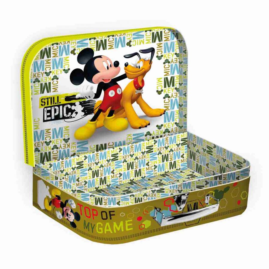 Papírový dětský kufřík velikosti 25 cm Disney Mickey. Kufřík je vyroben z kvalitního pevného kartonu s vnitřní potiskem a kovovým uzavíráním s rukojetí. Jeho využití v dětském světě je velké, možnost uložení hraček ale i jiných drobností na cestu k babičce.