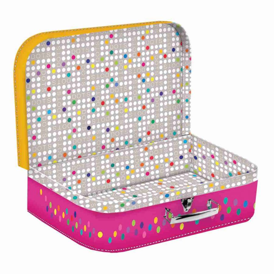 Papírový dětský kufřík velikosti 35cm Dots. Kufřík je vyroben z kvalitního pevného kartonu s vnitřní potiskem a kovovým uzavíráním s rukojetí. Je vhodný na školní potřeby, výtvarné potřeby, do kterého vejde i blok barevných papírů A4. Jeho využití v dětském světě je velké, možnost uložení hraček ale i jiných drobností na cestu k babičce.