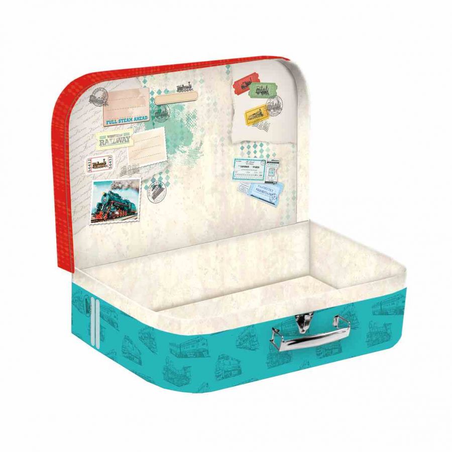 Papírový dětský kufřík velikosti 35cm Train Kufřík je vyroben z kvalitního pevného kartonu s vnitřní potiskem a kovovým uzavíráním s rukojetí. Je vhodný na školní potřeby, výtvarné potřeby, do kterého vejde i blok barevných papírů A4. Jeho využití v dětském světě je velké, možnost uložení hraček ale i jiných drobností na cestu k babičce.