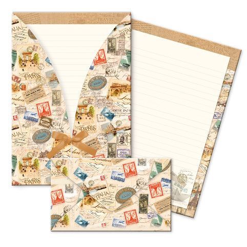 Dopisní papír s potiskem a k tomu barevně potištěné obálky. Dopisní souprava obsahuje 10 ks papíru s linkami a 10 ks barevně sladěných obálek. Celá dopisní souprava je zabalena v dárkovém balení s mašličkou.