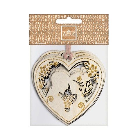 Dřevěná vyřezávaná ozdoba zavěšená na saténové šňůrce. Velmi vhodná jako ozdoba ke svatebnímu přání, ale také jako malý dárek pro přátele, které máte rádi. Uvedená cena je za 5 ks.