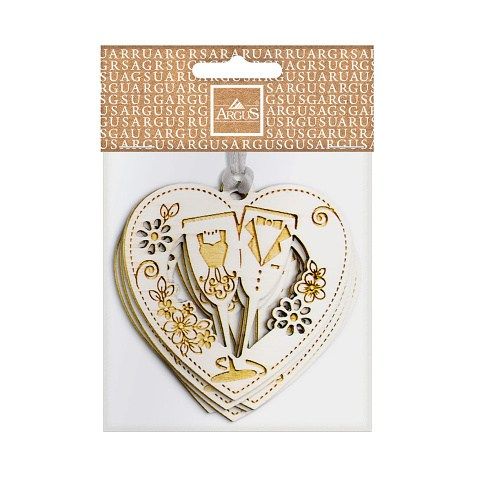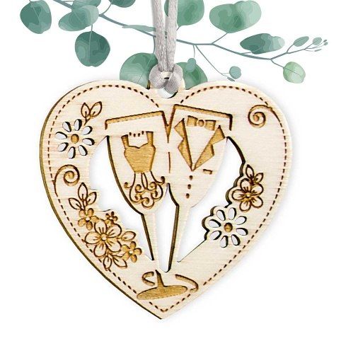 Dřevěná vyřezávaná ozdoba zavěšená na saténové šňůrce. Velmi vhodná jako ozdoba ke svatebnímu přání, ale také jako malý dárek pro přátele, které máte rádi. Uvedená cena je za 5 ks.