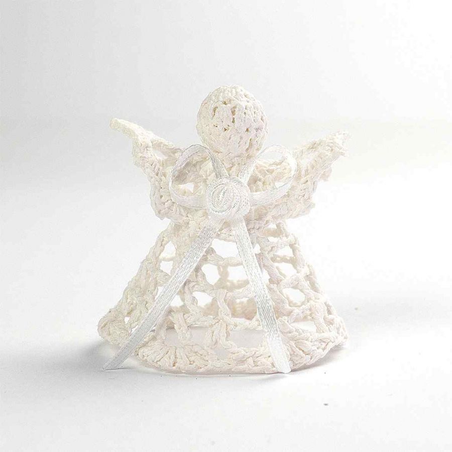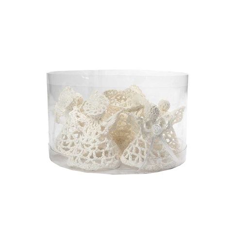 Háčkovaní andělé v plastovém boxíku. Andělé jsou háčkování z bílé bavlněné nitě. Každý andílek má malou šňůrku na zavěšení. Vhodné jako dárek i vánoční ozdoba na stromeček a také jako vánoční dekorace do aranžmá. 10 ks andělů v boxu.