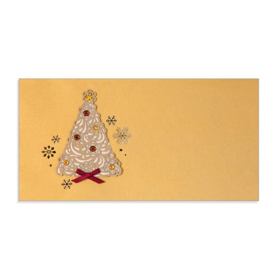 Vánoční obálka s ručně lepenými komponenty, se samolepicím uzavíráním, z pevnějšího papíru – zlatá perleť. Vhodná pro balení různých dárkových poukazů i peněz.