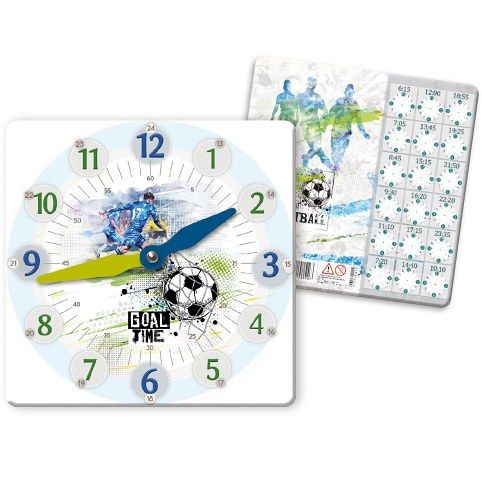 Papírové dětské hodiny na výuku GOAL TIME. Hodiny obsahují ciferník se zvýrazněnými čísly 3, 6, 9 a 12 také čísla od 1 po 12 a minutové dělení s pohyblivými ručičkami. Zadní strana hodinek slouží jako učební pomůcka, do které mohou děti zakreslovat čas, který dostanou za úkol.