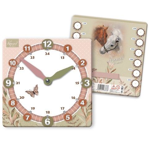 Papírové dětské hodiny na výuku Horses & me. Hodiny obsahují ciferník se zvýrazněnými čísly 3, 6, 9 a 12 také čísla od 1 po 12 a minutové dělení s pohyblivými ručičkami. Zadní strana hodinek slouží jako učební pomůcka, do které mohou děti zakreslovat čas, který dostanou za úkol.