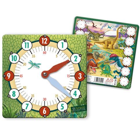 Papírové dětské hodiny na výuku Jurassic ADVENTURE. Hodiny obsahují ciferník se zvýrazněnými čísly 3, 6, 9 a 12 také čísla od 1 po 12 a minutové dělení s pohyblivými ručičkami. Zadní strana hodinek slouží jako učební pomůcka, do které mohou děti zakreslovat čas, který dostanou za úkol.