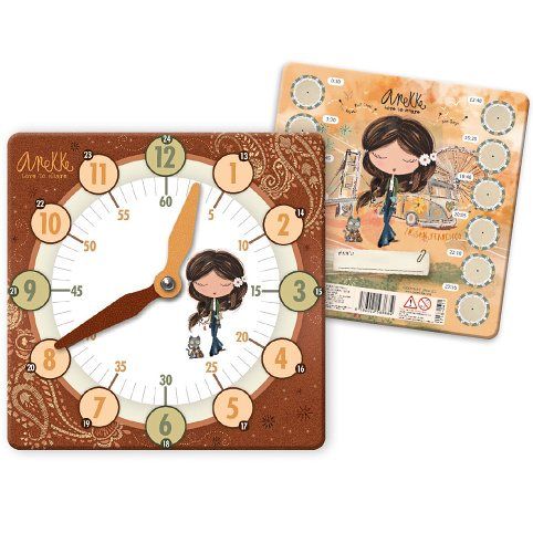 Papírové dětské hodiny na výuku s designem známého děvčátka Anekke z dílny španělské návrhářky. Hodiny obsahují ciferník se zvýrazněnými čísly 3, 6, 9 a 12 také čísla od 1 po 12 a minutové dělení s pohyblivými ručičkami. Zadní strana hodinek slouží jako učební pomůcka, do které mohou děti zakreslovat čas, který dostanou za úkol.