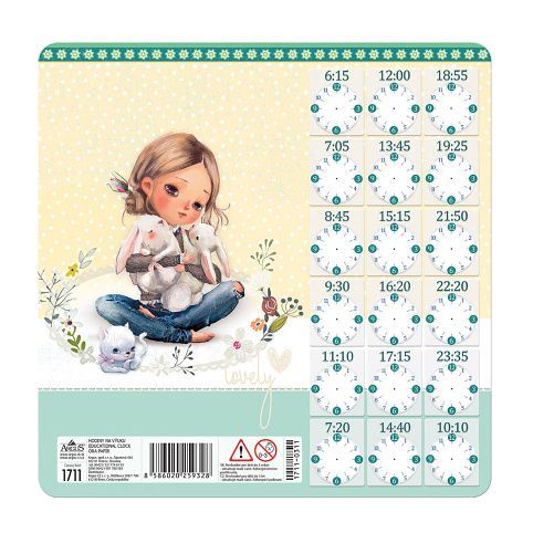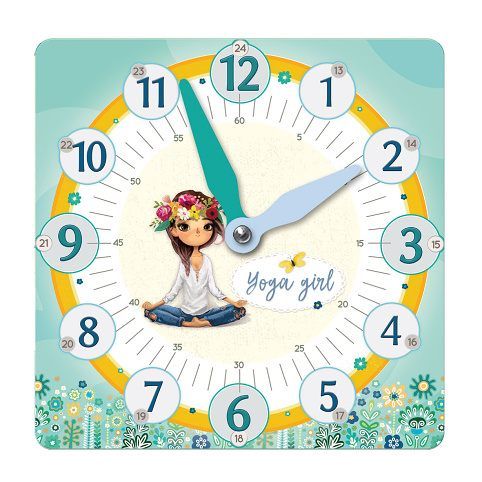 Papírové dětské hodiny na výuku Yoga girl. Hodiny obsahují ciferník se zvýrazněnými čísly 3, 6, 9 a 12 také čísla od 1 po 12 a minutové dělení s pohyblivými ručičkami. Zadní strana hodinek slouží jako učební pomůcka, do které mohou děti zakreslovat čas, který dostanou za úkol.