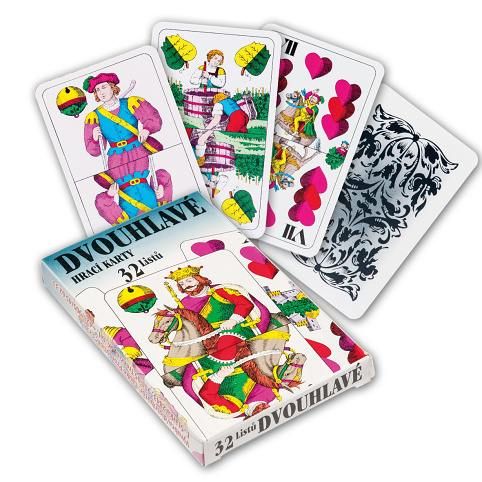 Zábava s kartami Mariáš. Sedmové karty, dvouhlavé. 32 ks karet v papírové krabičce.
