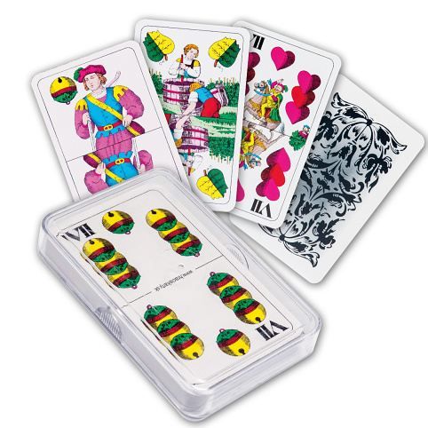 Zábava s kartami Mariáš. Sedmové karty, dvouhlavé. 32 ks karet v plastové krabičce.