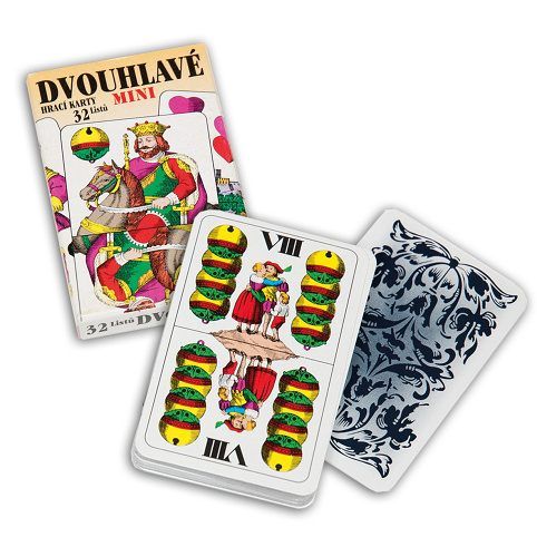 Zábava s kartami Mariáš. MINI sedmové karty, dvouhlavé. 32 ks karet v papírové krabičce.