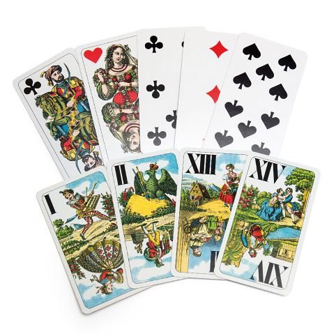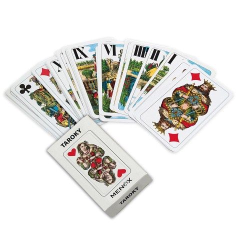 Zábava s kartami Mariáš - Taroky v papírové krabičce. Možnost použít jako výkladové karty pro věštění.