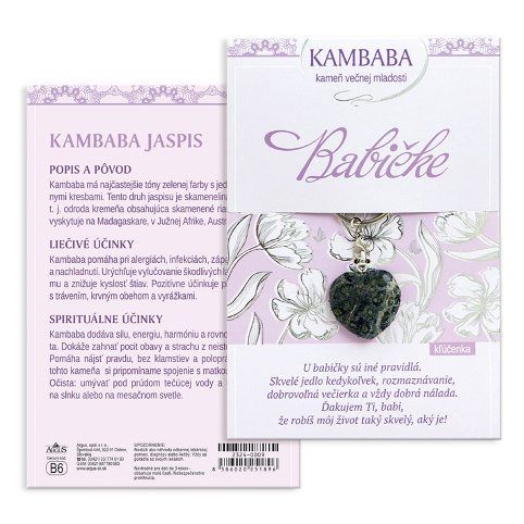 Babičke (slovensky) - přívěšek s léčivým kamenem, jedinečné přání s dárkem. Na zadní straně přání najdete charakteristiku léčivého kamene - popis a původ, léčivé účinky a také jeho spirituální účinky.