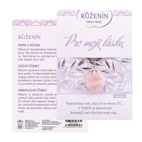 Pro moji lásku - přívěšek s léčivým kamenem, jedinečné přání s dárkem. Na zadní straně přání najdete charakteristiku léčivého kamene - popis a původ, léčivé účinky a také jeho spirituální účinky.