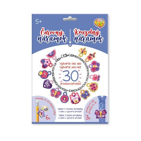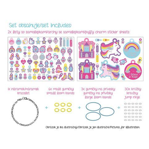 Kouzelný náramek, který si Vaše dítě samostatně vyrobí. Tato kreativní sada podporuje motoriku a budou z ní mít radost. Kreativní sada obsahuje 2 archy se samolepkami, náramek, 6 malých gumiček, 3 větší gumičky a 30 kroužků. Gumičky lze použít i na ozdobení tužky nebo zipu. Vhodné pro děti od 5 let.