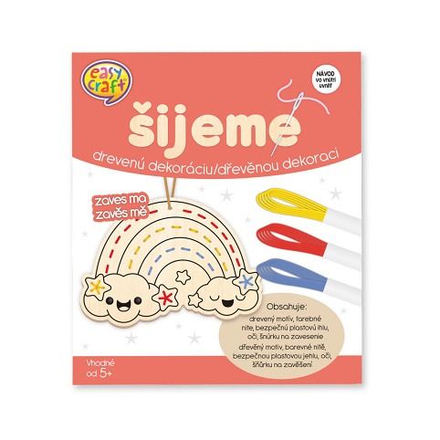Kreativní tvoření - šijeme si vlastní dřevěnou dekoraci protkanou barevnou nití. Kreativní sada obsahuje dřevěnou duhu s vyříznutými dírkami s velkou plastovou jehlou s tupým hrotem. Také obsahuje barevné nitě, duhu lze zavěsit například v dětském pokoji na zeď, poličku nebo světlo. Hotová duha má velikost 12,5 x 10,5 cm. Vhodné pro děti od 4 let. Podporuje dovednost dítěte.