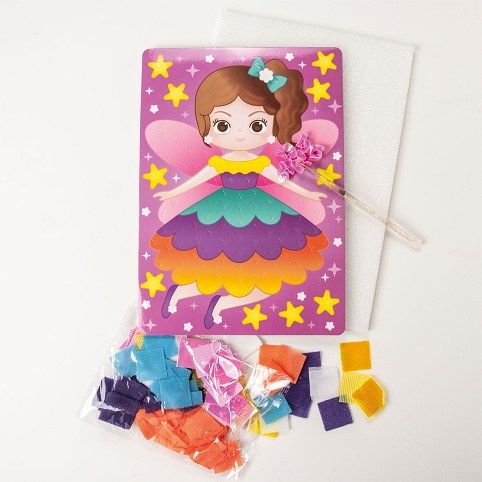 Kreativní tvoření - vytvoř si veselý obrázek - víla. * barevný obrázek si dítě vytvoří vkládáním barevných čtverců do podkladové desky * kreativní sada obsahuje barevnou pěnovou podložku, kousky barevné látky ve tvaru malých čtverců, plastovou jehlu s typovým hrotem * vhodné pro děti od 4 let * podporuje zručnost, trpělivost, jemnu motoriku a fantazii dítěte
