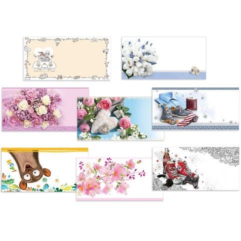 Box bílých obálek rozměru DL s potiskem, samolepicí. Vhodné pro balení různých dárkových poukazů, ale i peněz.