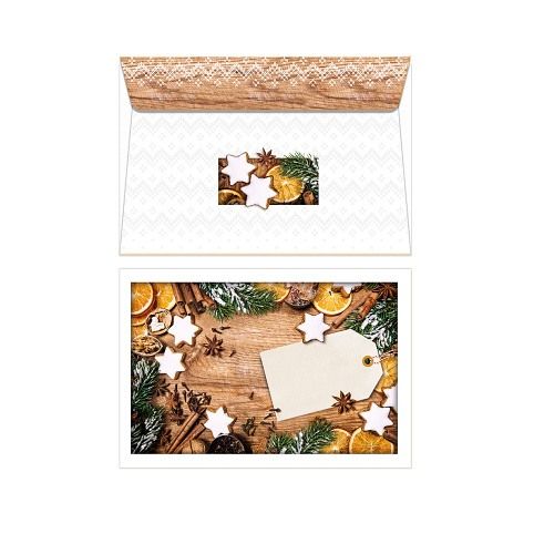 Bílá obálka rozměru B6 s potiskem vánoční tematiky, se samolepícím uzavíráním. Vhodná pro balení různých dárkových poukazů i peněz.