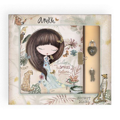 Krásné památníky se zámkem pro dívky s motivem známého děvčátka Anekke z dílny španělské designérky. Děti mohou do poznámek zapisovat svá tajemství a sny. Se zámkem budou vždy v bezpečí. Památník se zámkem v dárkovém balení obsahuje 60 listů, stuha slouží jako záložka. Balení obsahuje: 1 zámek + 2 klíčky.
