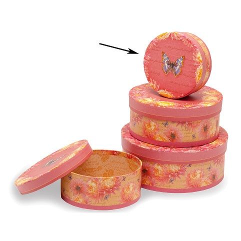 Nádherní papírová krabice ve tvaru kruhu z dílny ARGUSu - květinové motivy. Vhodná nejen k zabalení dárků, ale také jako dekorace do bytu a odkládací prostor pro různé drobnosti v poličkách vašeho domova.