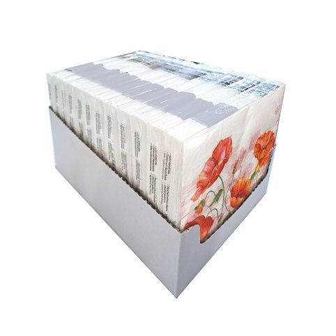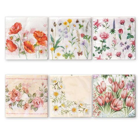 Papírové ubrousky s květinovým motivem - 33x33 cm, třívrstvé. V jednom balení je 20 ks ubrousků. Prodejní balení box obsahuje mix 2 x 6 motivů. Minimální odběr je 12 ks balení ubrousku.