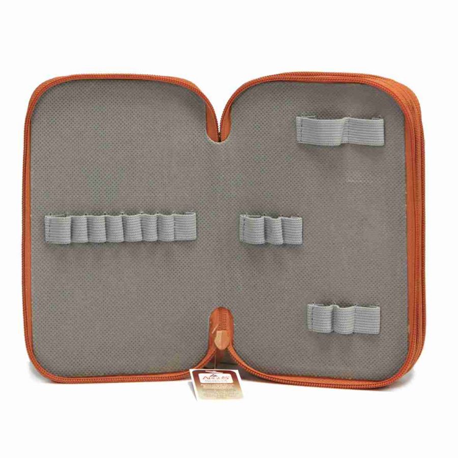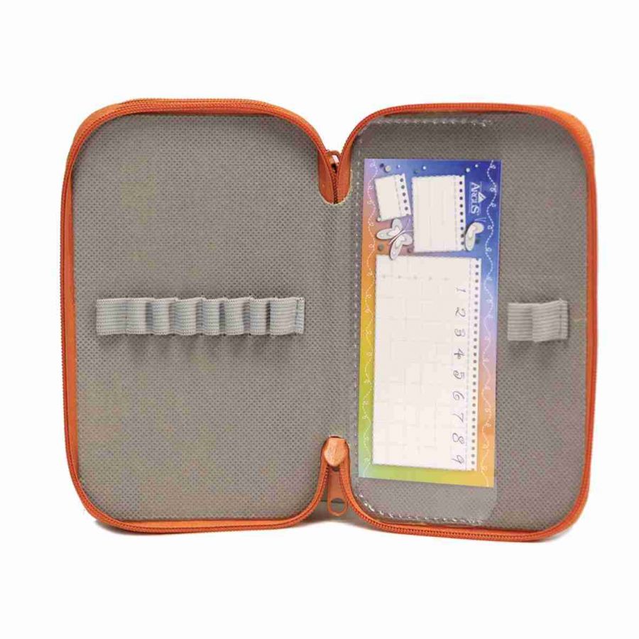 Dvoupatrový školní pouzdro. Penál nabízí dva úložné prostory pro úschovu psacích potřeb a dalších školních pomůcek. Uzavírání obou pater je pomocí zipu s poutky pro lepší manipulaci. V první komoře se nacházejí gumičky na pravítko, ořezávátko, gumu a poutka pro 10 pastelek. V druhé najdete 10 poutek na pera, fixy, pastelky, propisky a jiné potřeby. V této druhé komoře najdete vložený rozvrh hodin s obrázkem pod fólií, kde mohou být uloženy i jiné odkazy a lístečky. Pod rozvrhem jsou ještě 2 poutka z gumiček. Penál je bez výbavy.