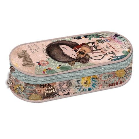 Praktický a prostorný oválný penál z dílny španělské návrhářky s motivem děvčátka Anekke. Je vybaven vnitřní kapsou na zip a rozvrhem hodin, který je vložen pod fólií na klopě. Ta odděluje horní část penálu a má na sobě gumičky pro uchycení potřeb na psaní. Každý zip je ukončen ozdobou s designem Anekke.
