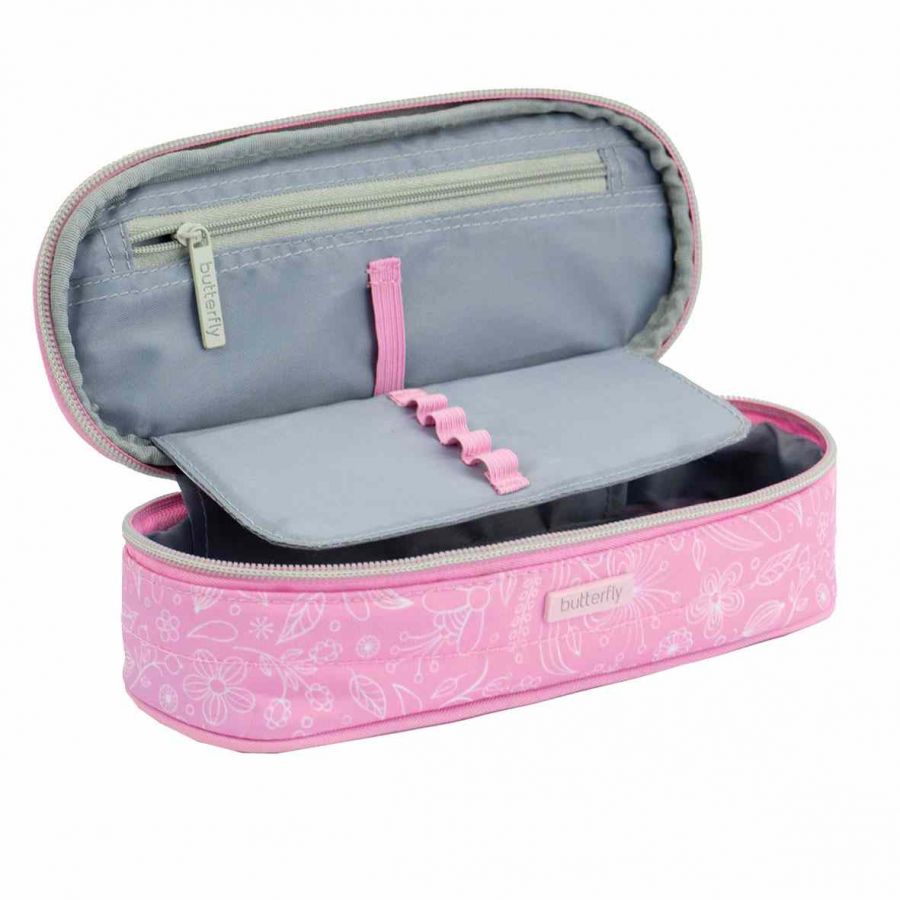 Praktický a prostorný oválný penál Butterfly. Je vybaven vnitřní kapsou na zip a rozvrhem hodin, který je vložen pod fólií na klopě. Ta odděluje horní část penálu a má na sobě gumičky pro uchycení potřeb na psaní. Každý zip je ukončen ozdobou.