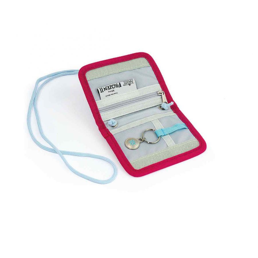 Dětská školní peněženka Disney Frozen 2 na krk nebo do školní tašky. Má vnitřní kapsu na zip, úchyt na klíček a více přihrádek. Peněženka je uzavřená suchý zipem, který brání jejímu otevření.