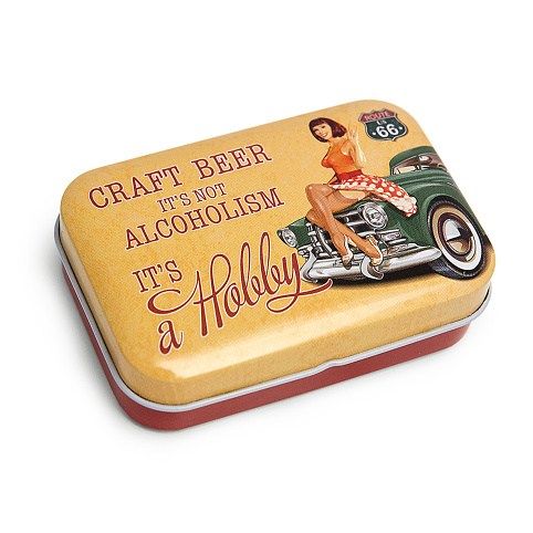 Plechová krabička s odklápěcím víkem na pant a potiskem. Vhodná pro různé drobnosti v domácnosti ale i jako malý dárek.