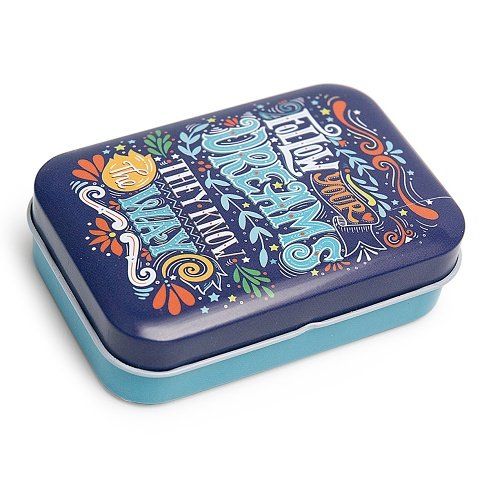 Plechová krabička s odklápěcím víkem na pant a potiskem. Vhodná pro různé drobnosti v domácnosti ale i jako malý dárek.