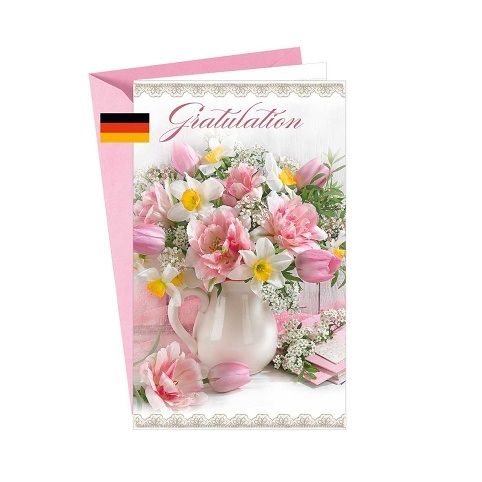 Přání k narozeninám, svátku nebo jiné příležitosti. Německý text na přední straně a bez textu uvnitř. Součástí blahopřání je barevně sladěna obálka. Originální technologie zpracování přáníčka od společnosti ARGUS - "Na detailu záleží!"