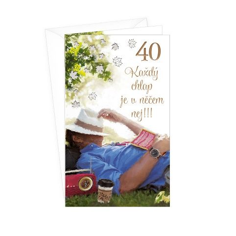 Přání k 40. narozeninám pro muže s textem uvnitř. Součástí blahopřání je barevně sladěna obálka. Originální technologie zpracování přáníčka od společnosti ARGUS - "Na detailu záleží!"